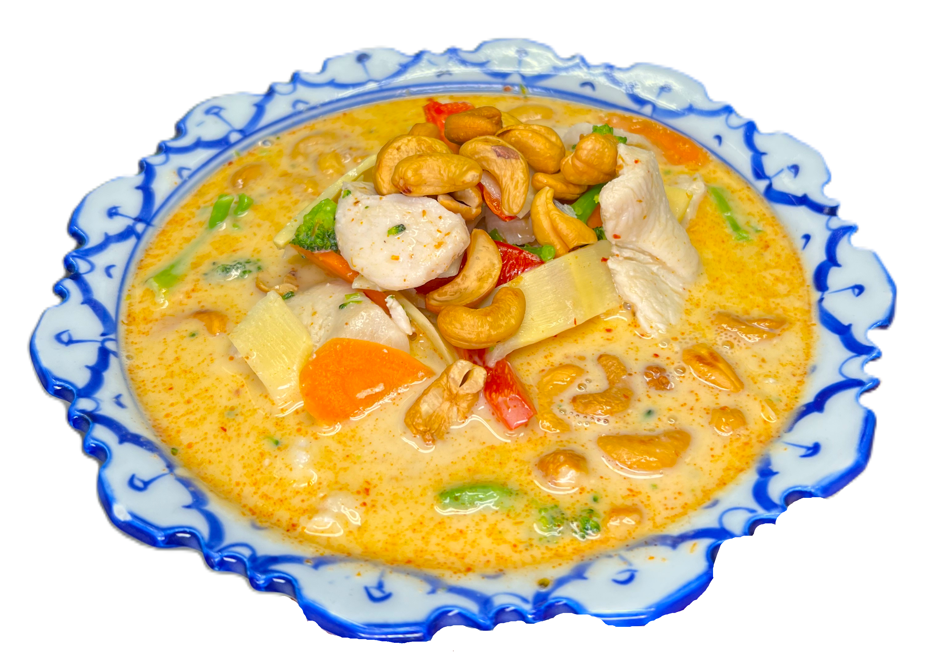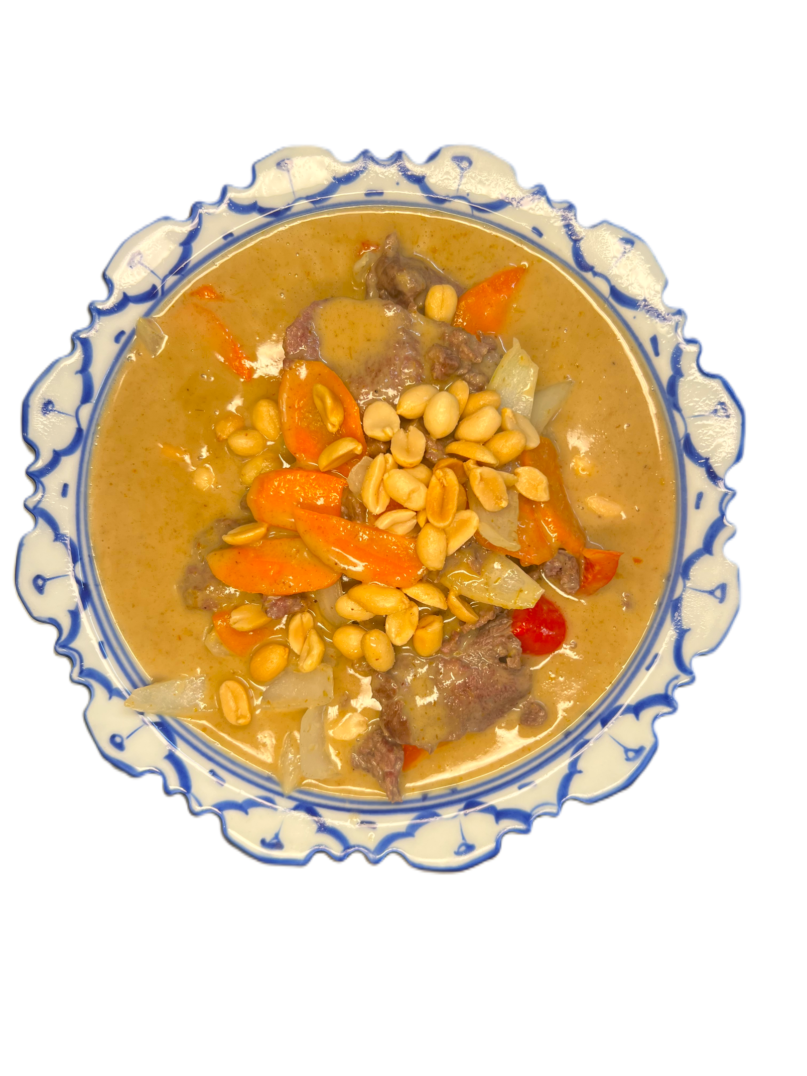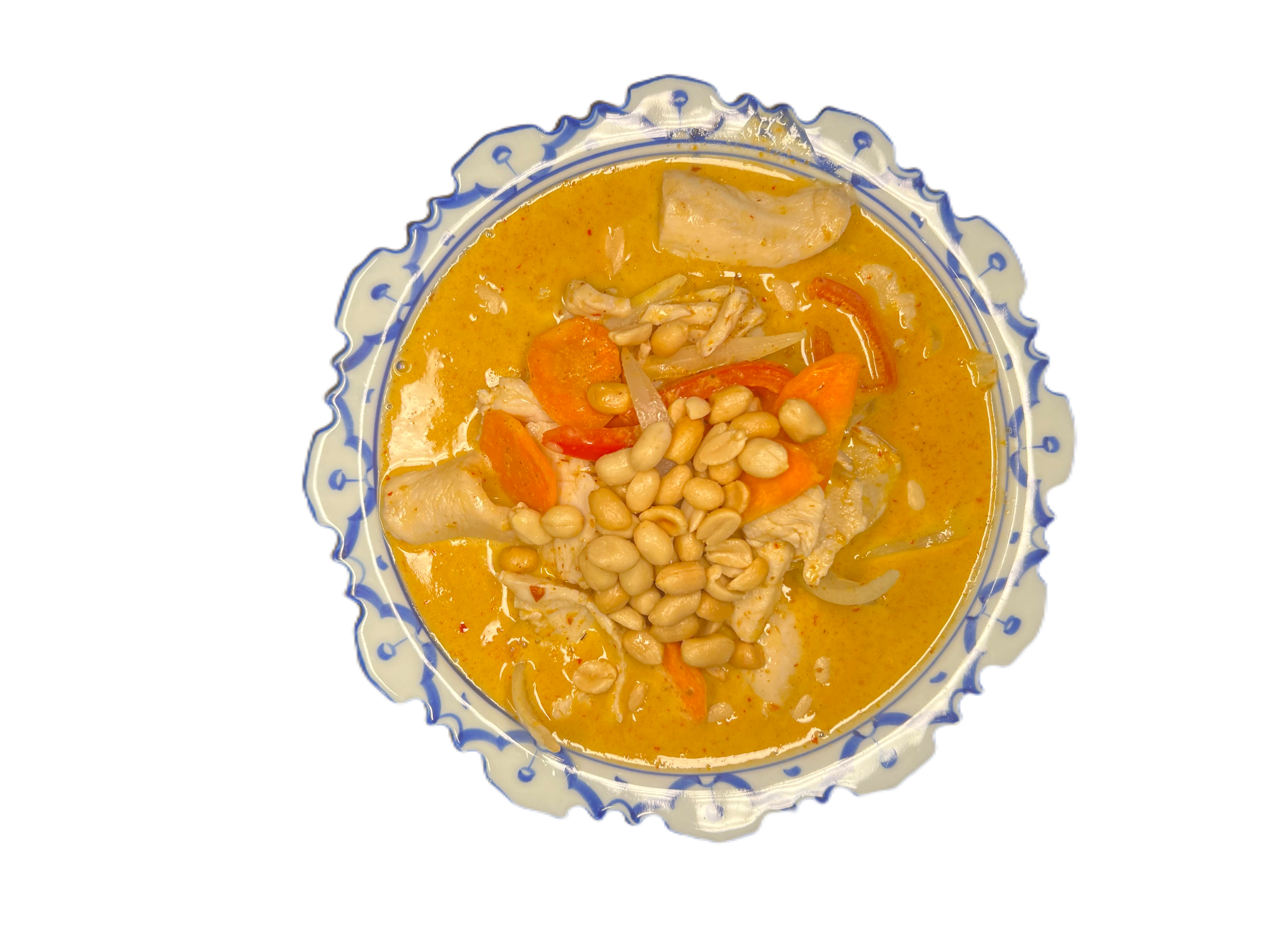 Massaman curry med valfri fyllning, grönsaker och kokosmjölk. Toppas med jordnötter och serveras med ris 🌶️🌶️