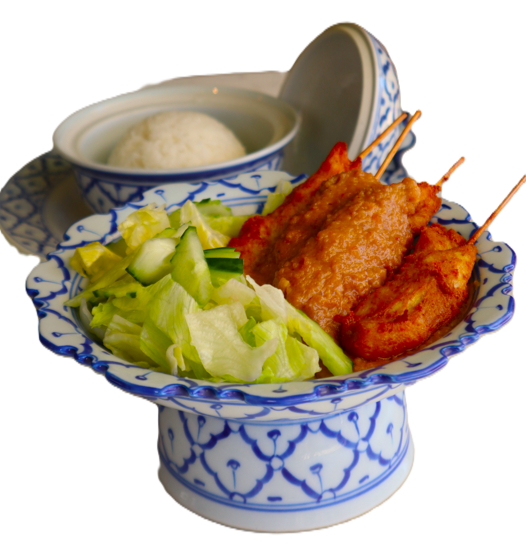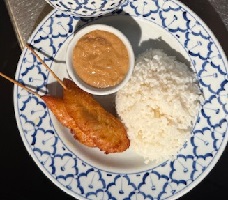 2st kycklingspett med jordnötssås, serveras med ris 🌶️