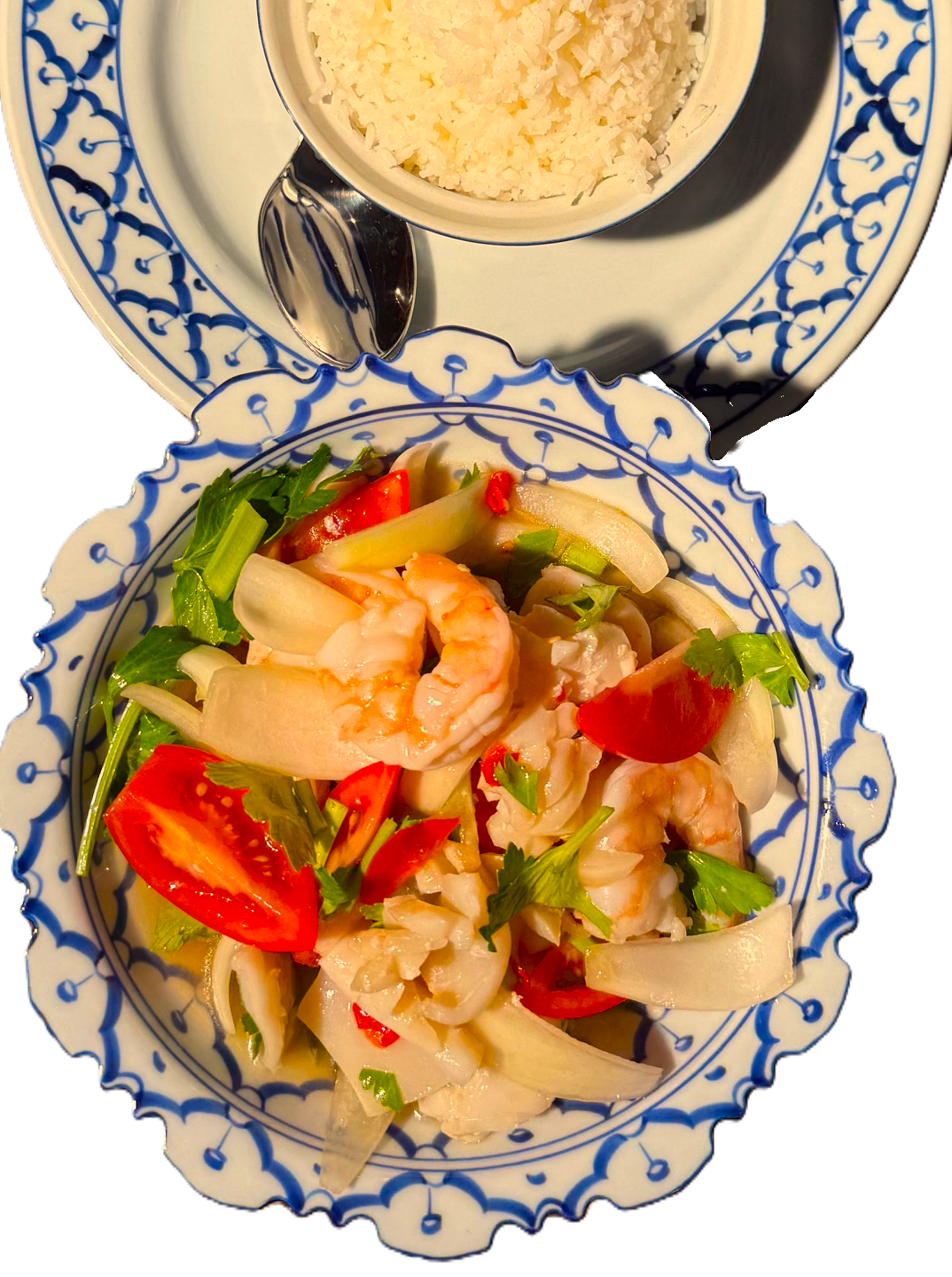 Wokad biff, Scampi ock Kyckling i thailändska sallad. Serveras med ris🌶️🌶️