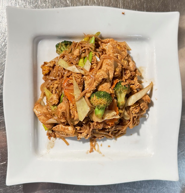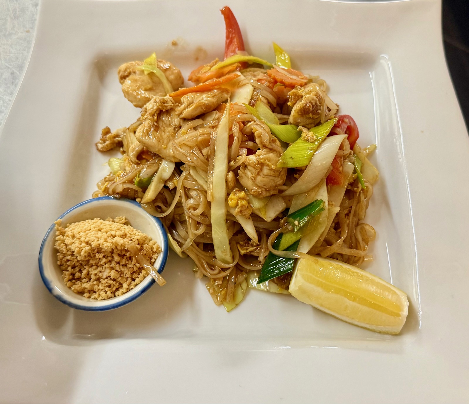 En klassisk thailändsk nudelrätt med kyckling, ägg och tamarindsås.