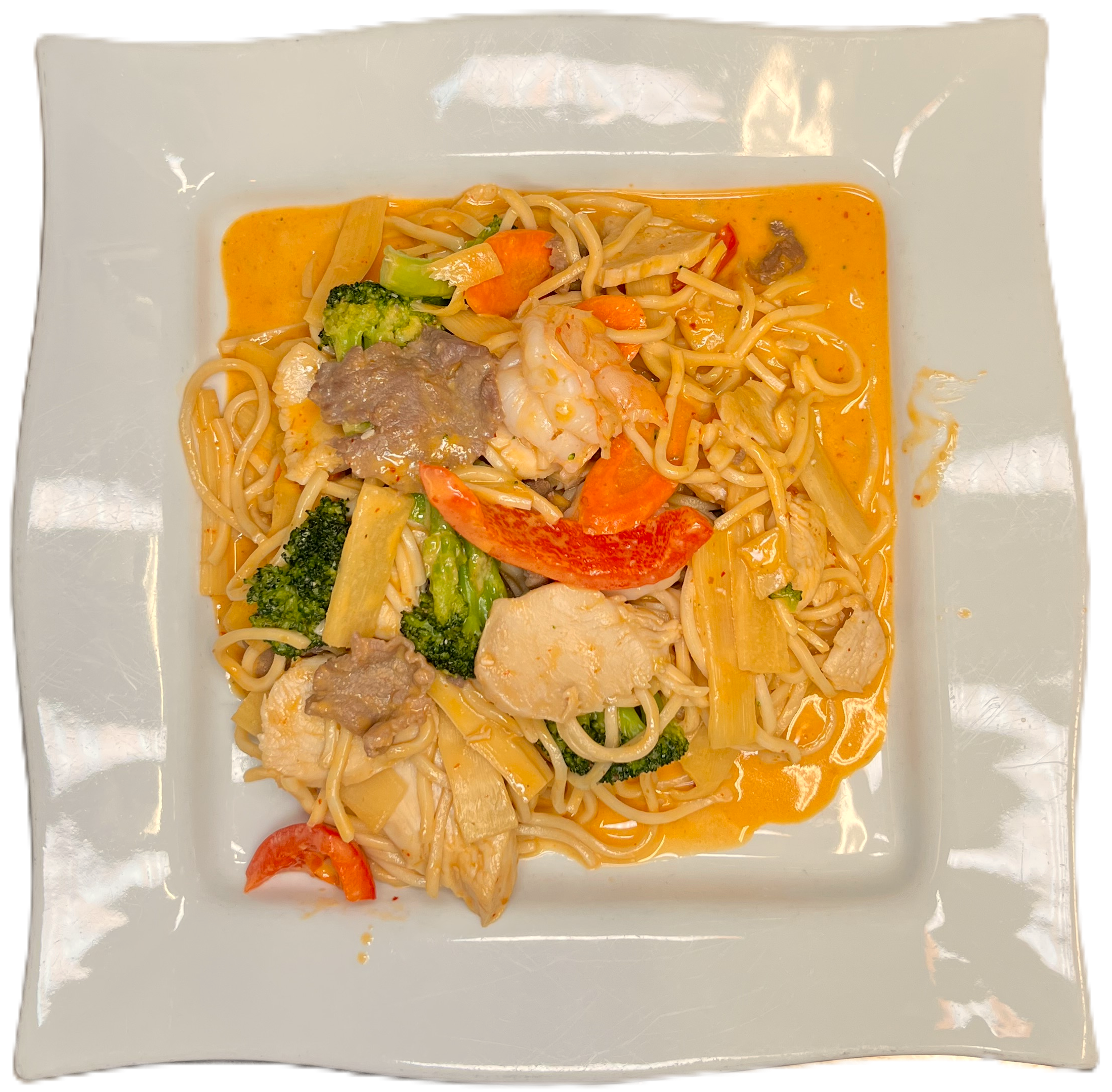 Wokade äggnudlar med Biff, Scampi, Kyckling och grönsaker i kokosmjölk med Thai Ma Dee`a Curry🌶️🌶️