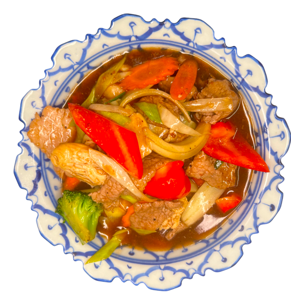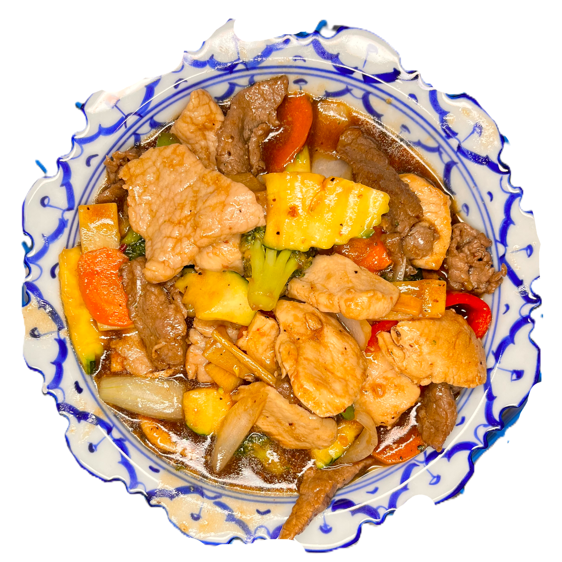 Wokad biff, fläskfile ock Kyckling med vitlök och peppar. Serveras med ris🌶️