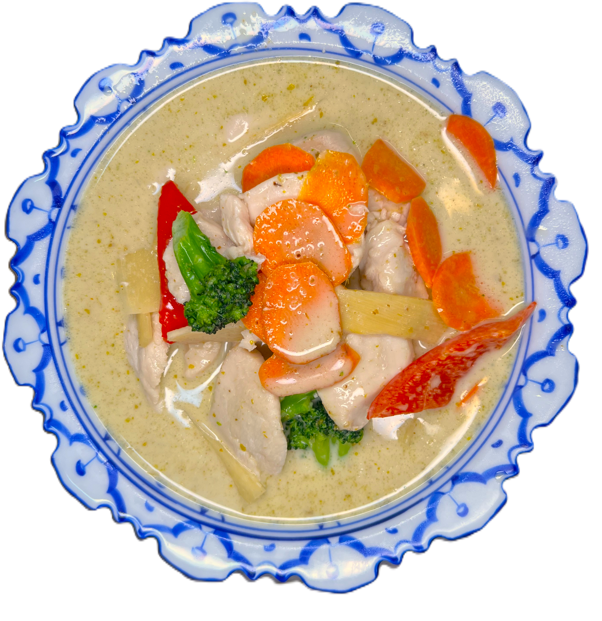 Grön curry med valfri fyllning, grönsaker och kokosmjölk, serveras med ris🌶️🌶️