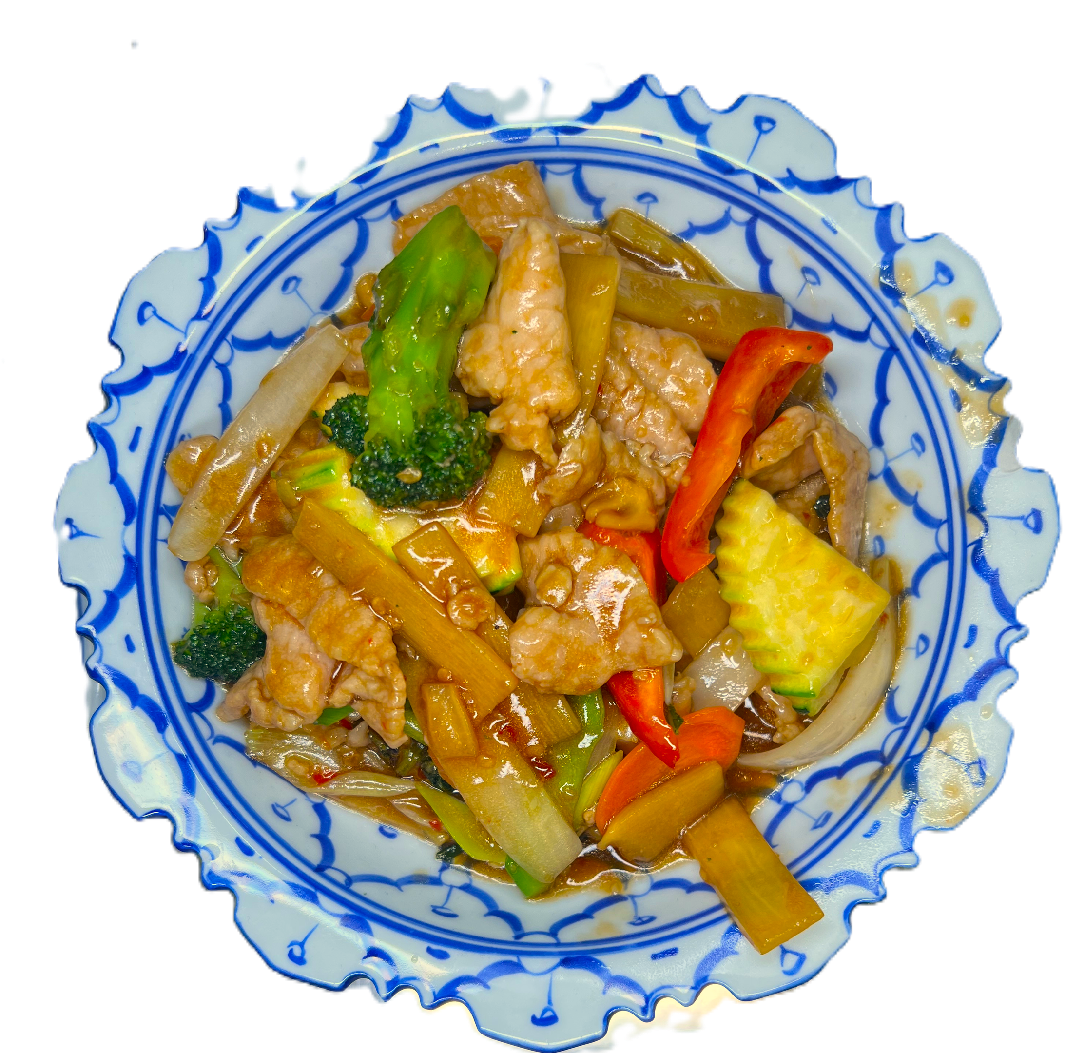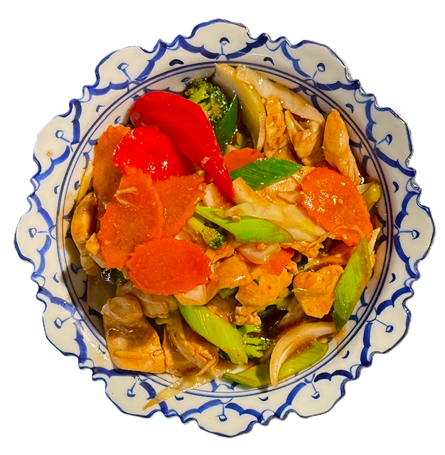 Wok med färsk chili, grönsaker, vitlök, bambuskott och thailändska basilika. serveras med ris 🌶️🌶️🌶️ (Valfri Fyllning)