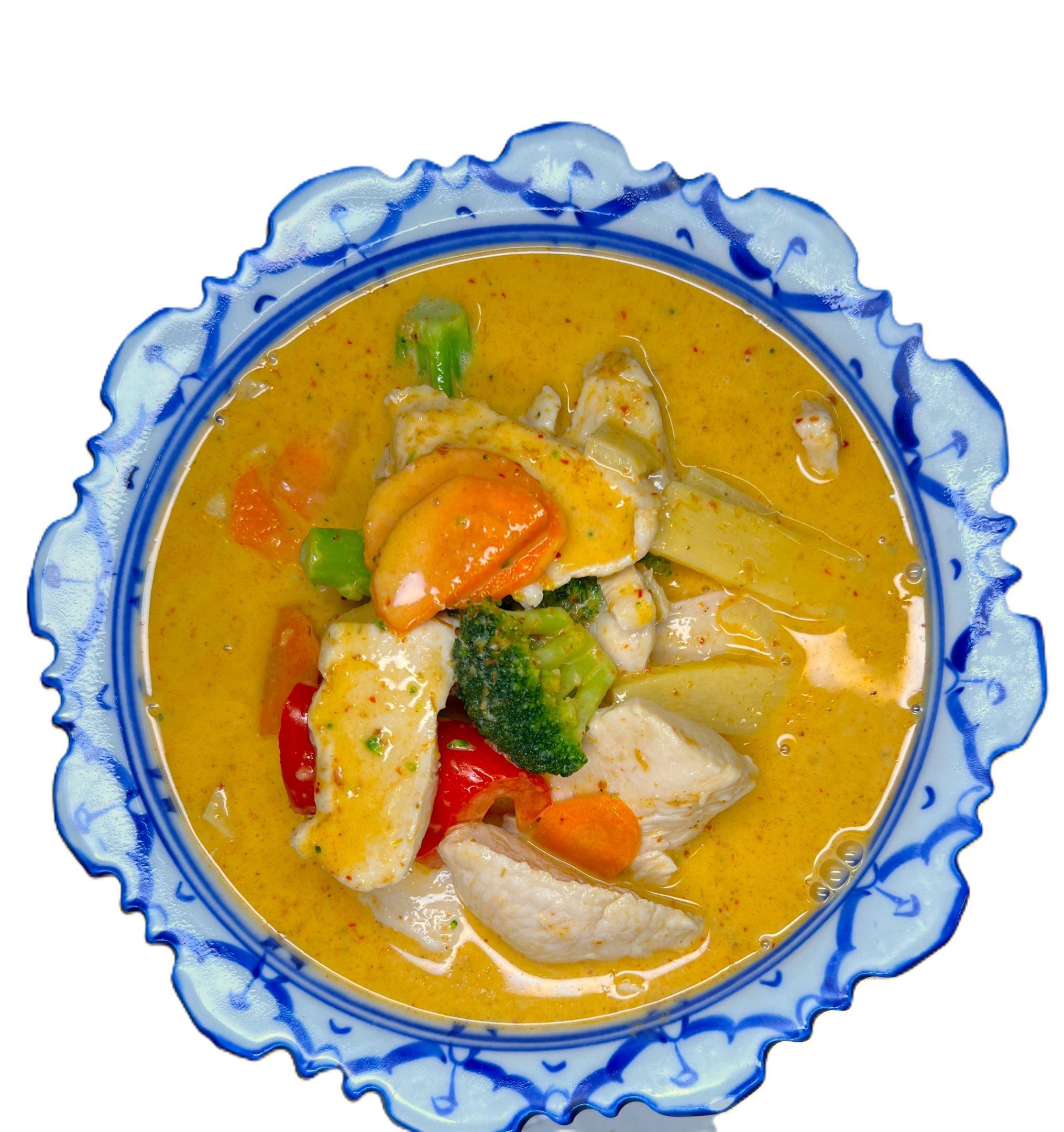 Gul curry med valfri fyllning, grönsaker och kokosmjölk. Toppas med jordnötter och serveras med ris🌶️🌶️