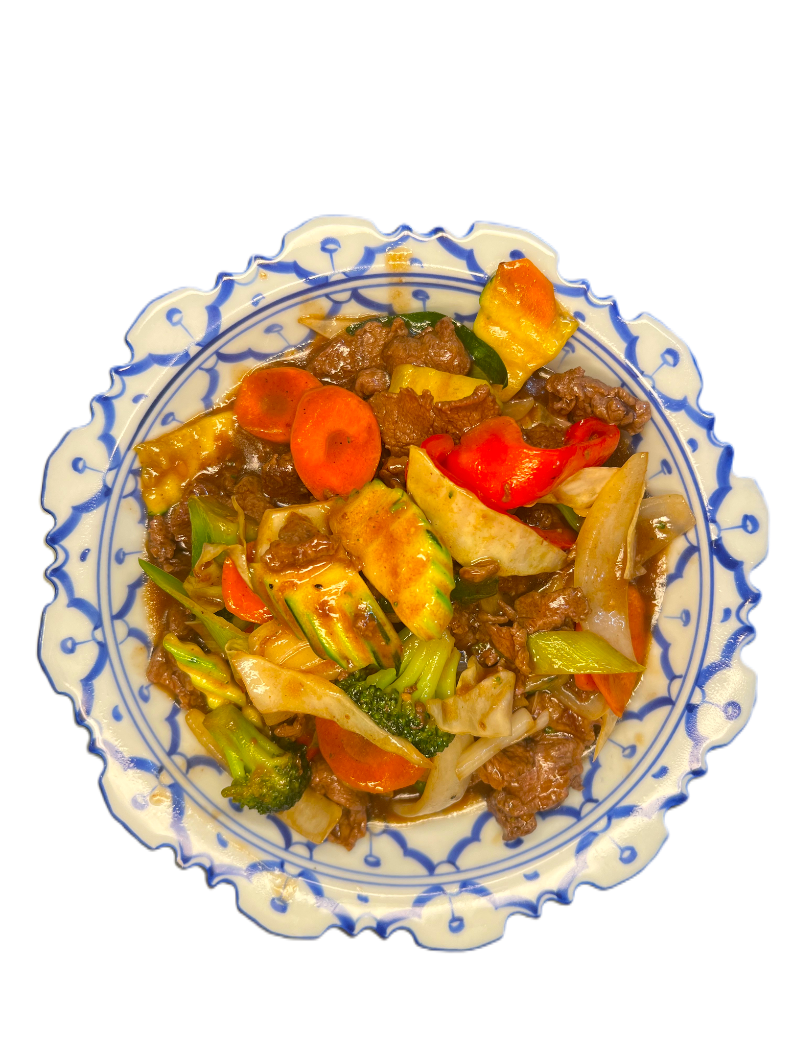 Wok med grönsaker och ostronsås, serveras med ris (Valfri Fyllning)