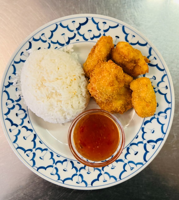 Friterad kyckling med söt chilisås, serveras med ris🌶️