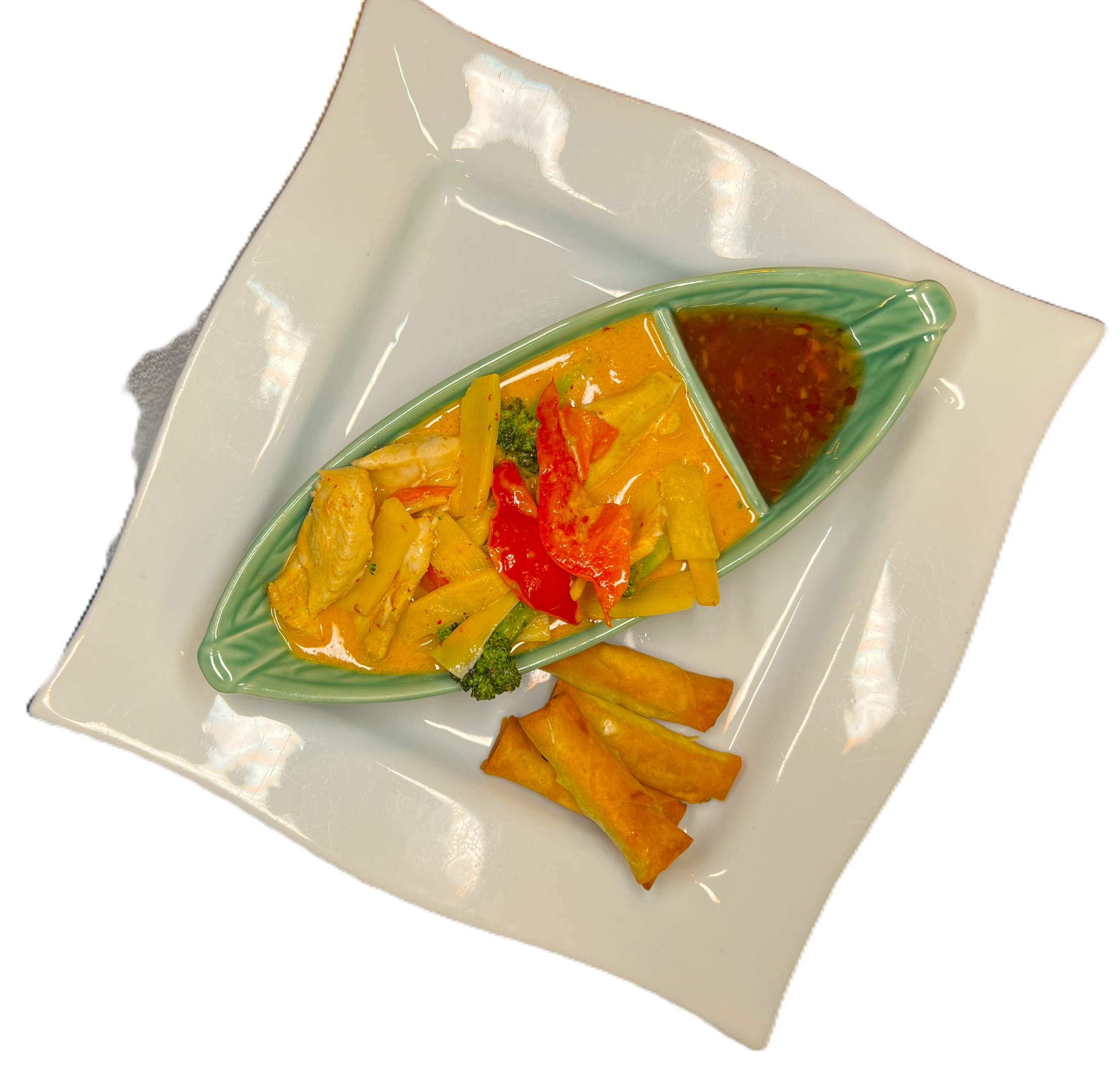 Röd curry med valfri fyllning, grönsaker och kokosmjölk, serveras med ris🌶️🌶️🌶️