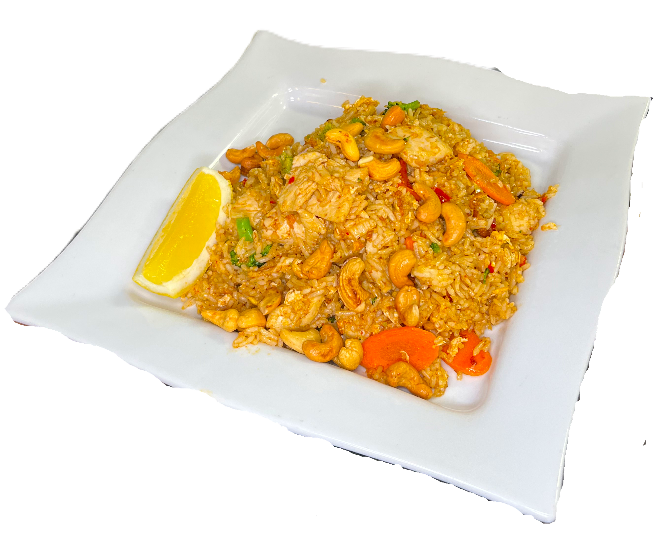 Stekt ris med chilipasta, ägg och grönsaker, toppas med cashewnötter. serveras med citronklyfta 🌶️🌶️🌶️🌶️