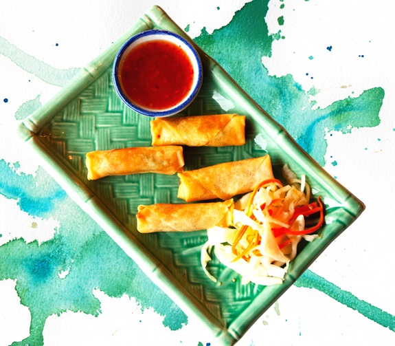 Fyra små vegetariska vårrullar fyllda med glasnudlar och grönsaker, serveras med söt chilisås 🌶️