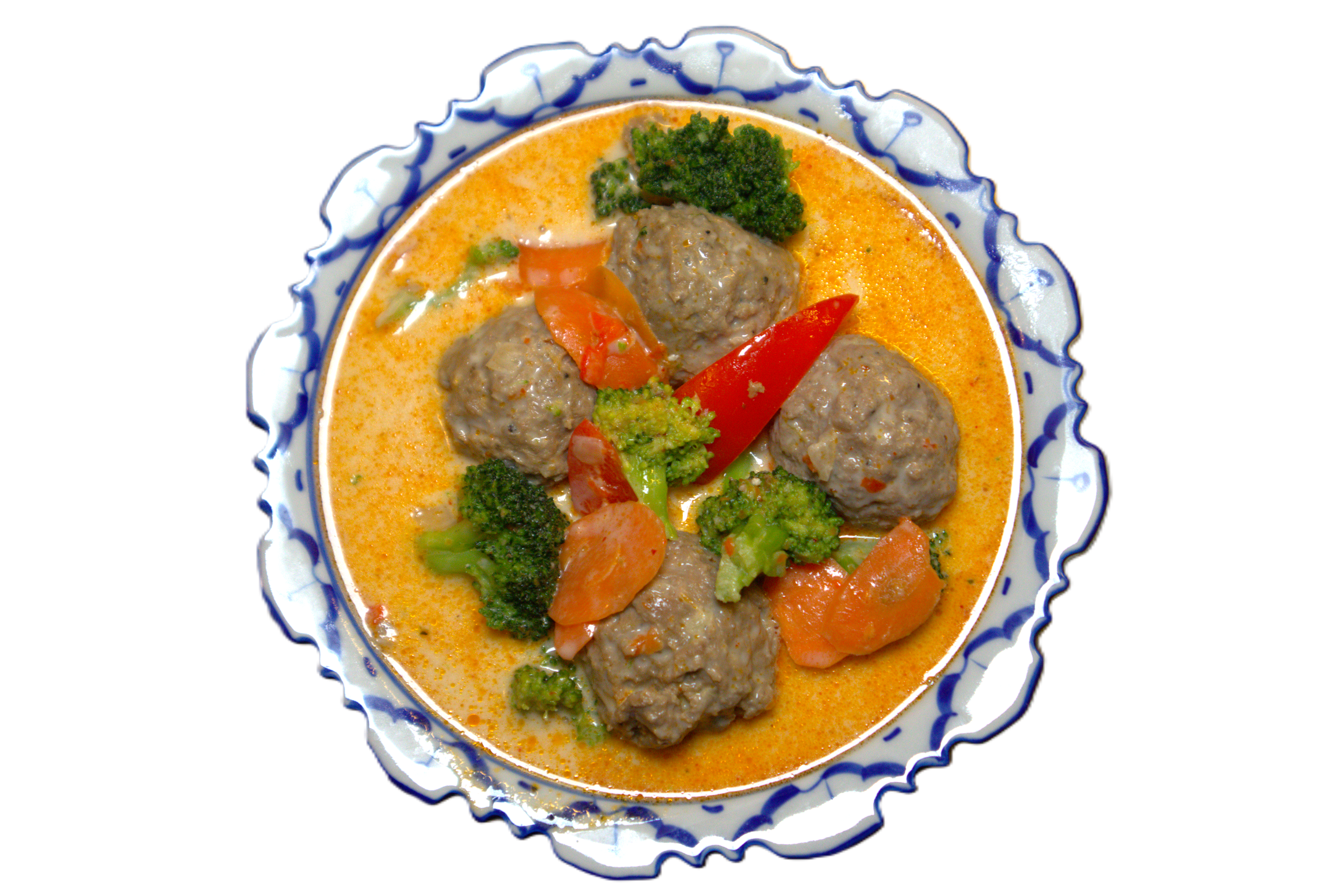 Köttbullar i panang curry med grönsaker och kokosmjölk, serveras med ris 🌶️🌶️🌶️